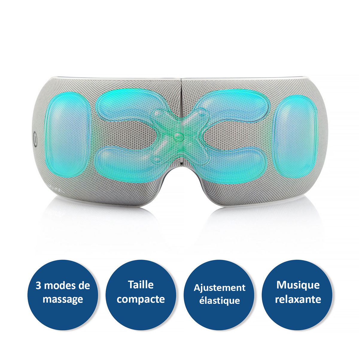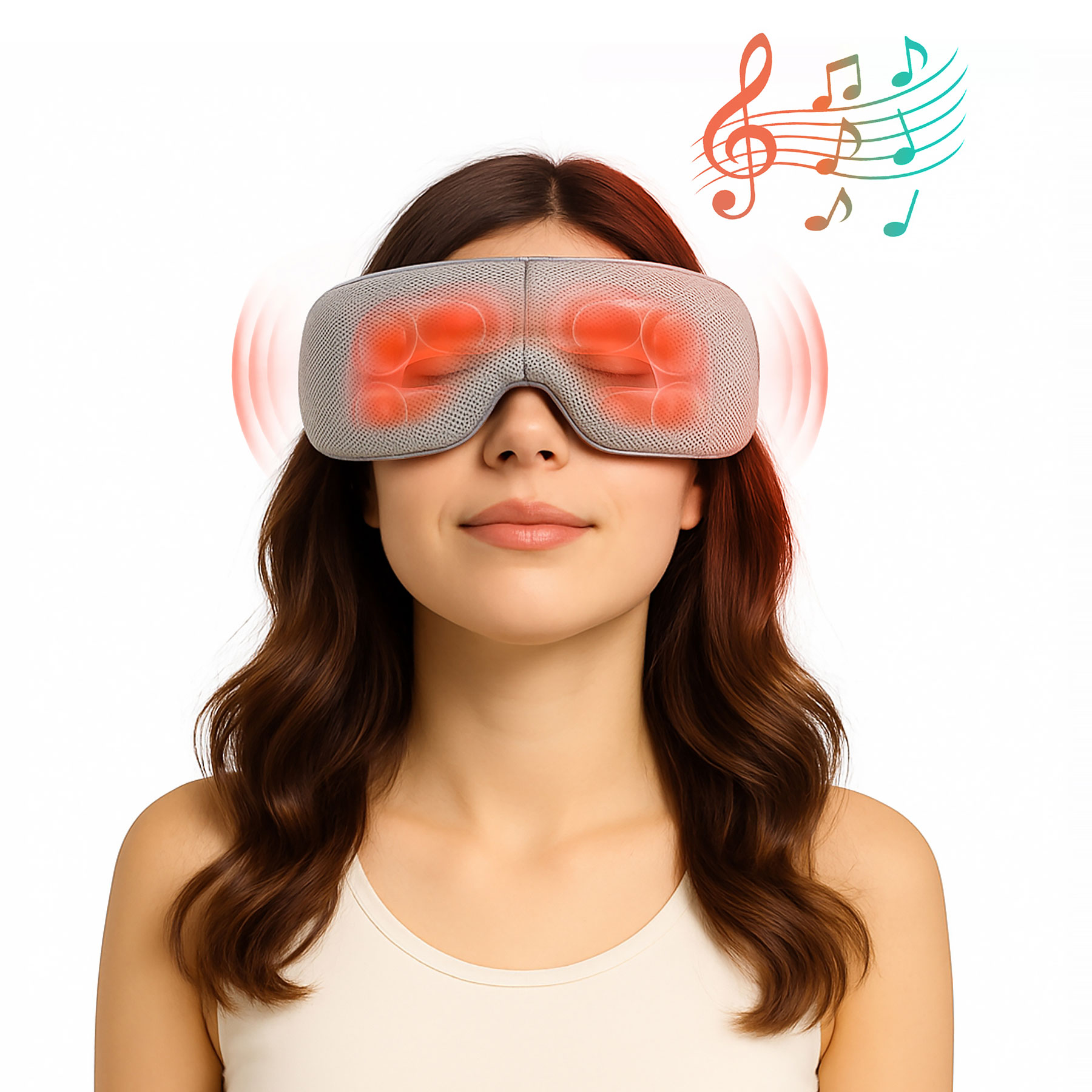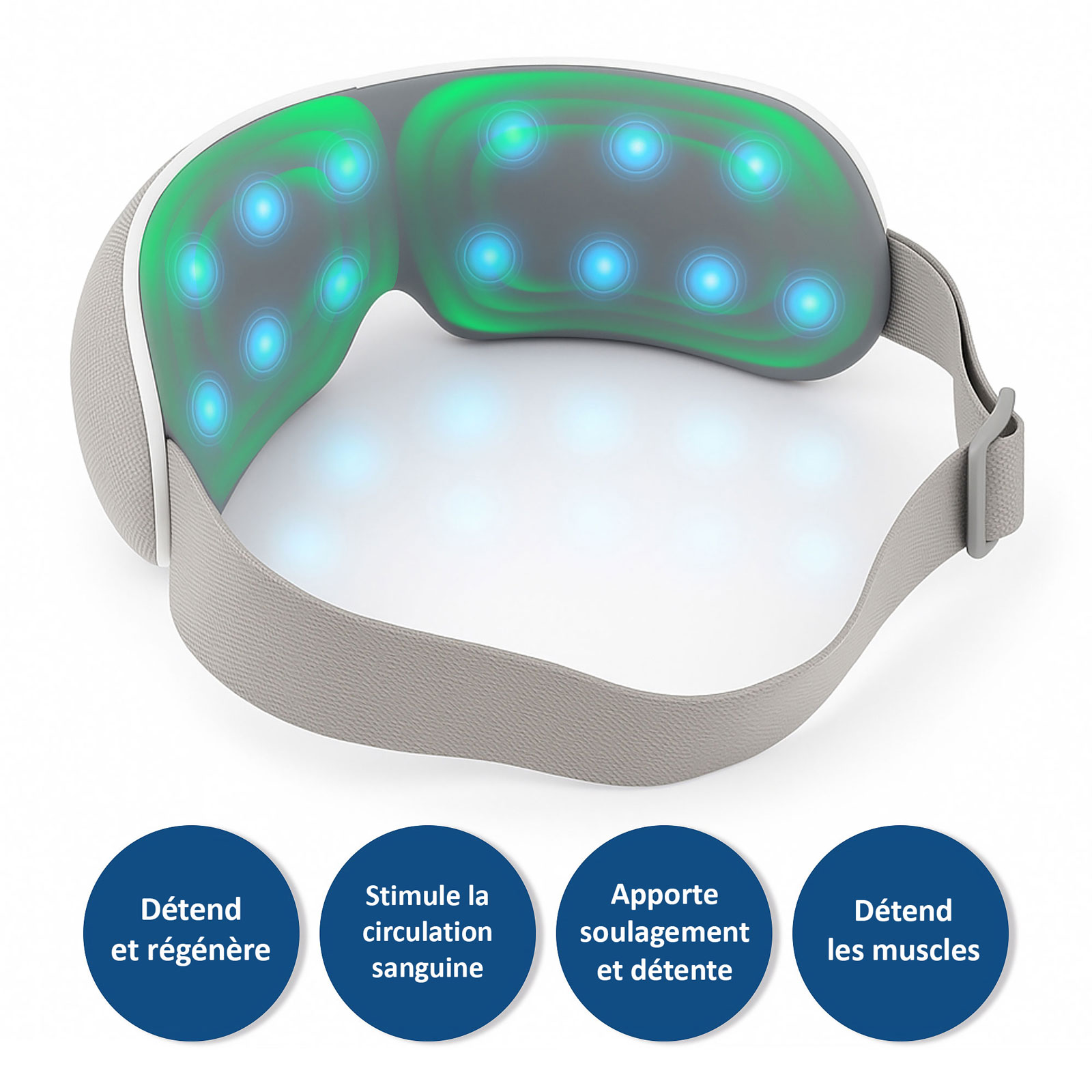 Le masseur détend doucement les tempes et le contour des yeux, réduisant la fatigue, tandis que la compresse chaude rafraîchit et revitalise la vue.