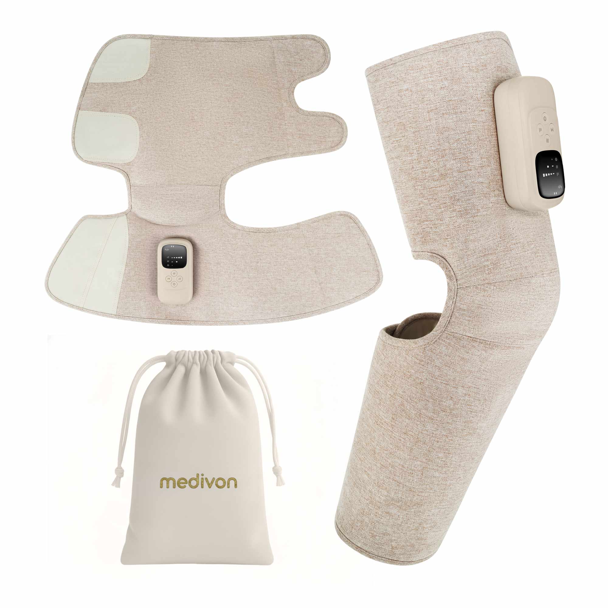 Medivon Solé Duo est un appareil moderne de massage des jambes sans fil, conçu pour offrir un maximum de confort et de mobilité. Deux manchons de jambes indépendants – chacun équipé de son propre système de pompe et de sa propre batterie – permettent de masser une jambe ou les deux en même temps, exactement comme vous en avez besoin.